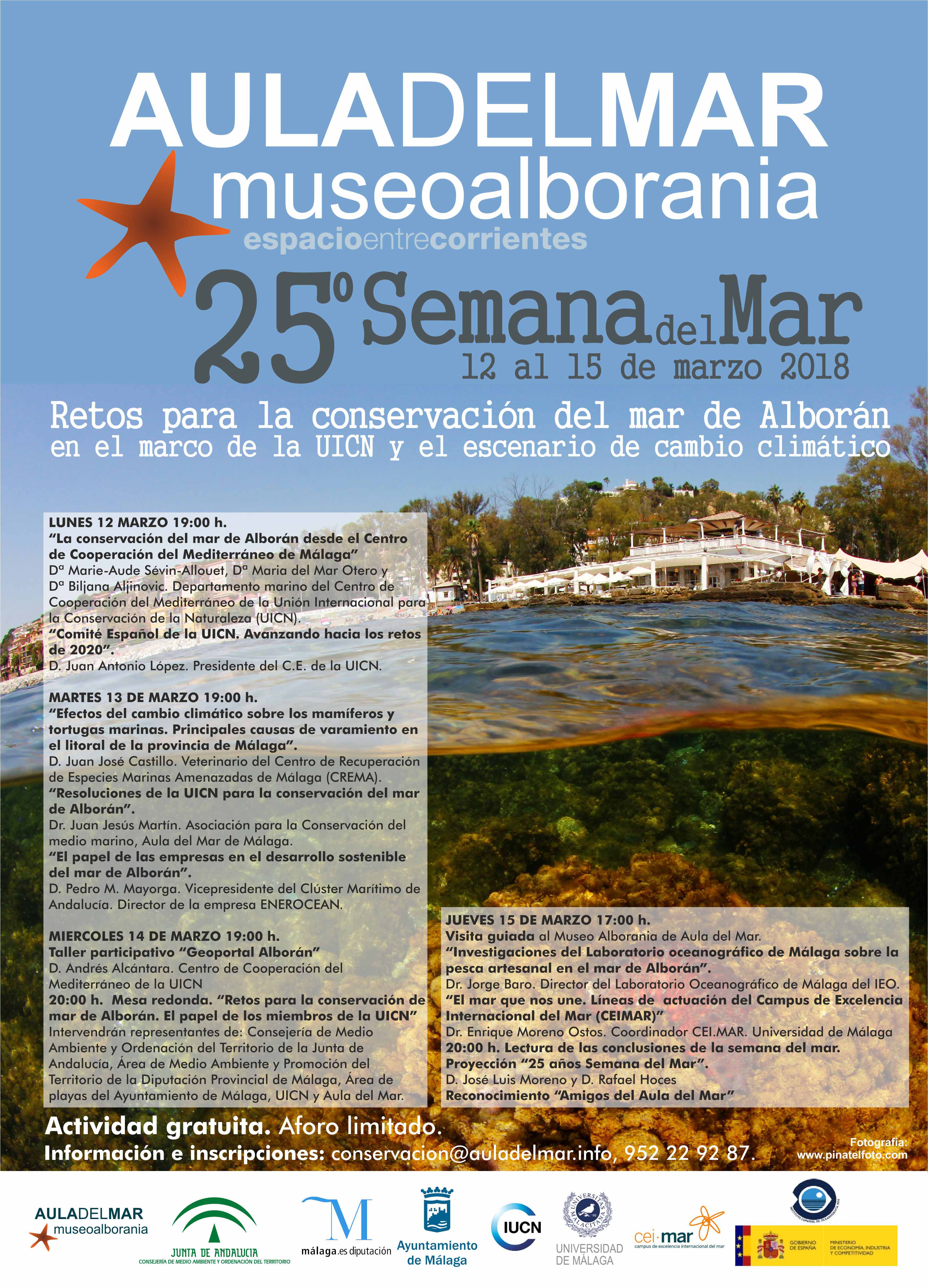 Además, hasta el jueves 15 se está desarrollando en Aula del Mar-Alborania (Palmeral de las Sorpresas) la la 25 Semana del Mar, con un amplio programa compuesto de mesas redondas y ponencias de especialistas que concluirá con una visita guiada al Museo Alborania y una proyección (Ver cartel). Las actividades son gratuitas y dado el aforo limitado los organizadores recomiendan inscripción previa (conservacion@auladelmar.info, o bien en el teléfono 952 22 92 87).